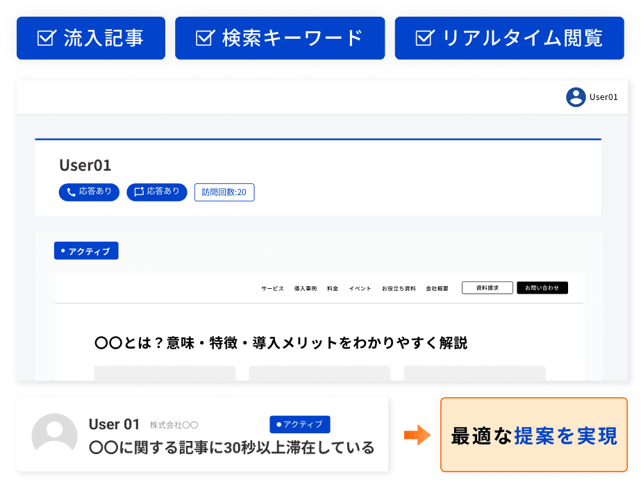 訪問者がどのページを見ているか、どこで迷っているかをリアルタイムで把握。閲覧状況に応じて最適なメッセージや提案を届けることで、信頼とエンゲージメントを高めます。